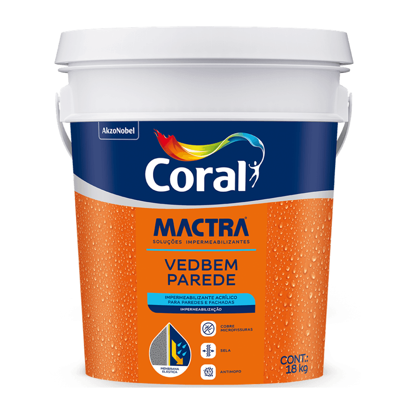O Coral Mactra Vedbem Parede é um impermeabilizante acrílico desenvolvido para vedação e proteção de superfícies externas e internas. Indicado para paredes sujeitas à umidade, infiltrações leves e microfissuras, forma uma película resistente que ajuda a evitar a passagem de água e aumenta a durabilidade da pintura. Possui fácil aplicação, ótima aderência e pode ser utilizado como base preparadora antes do acabamento, garantindo melhor desempenho e maior vida útil da pintura.
