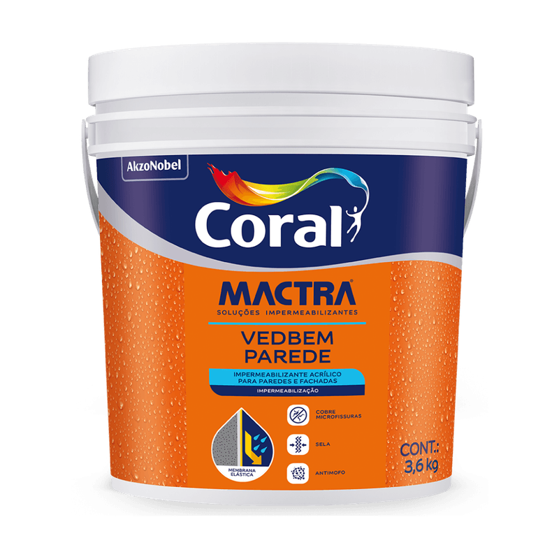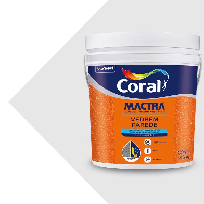 O Coral Mactra Vedbem Parede é um impermeabilizante acrílico desenvolvido para vedação e proteção de superfícies externas e internas. Indicado para paredes sujeitas à umidade, infiltrações leves e microfissuras, forma uma película resistente que ajuda a evitar a passagem de água e aumenta a durabilidade da pintura. Possui fácil aplicação, ótima aderência e pode ser utilizado como base preparadora antes do acabamento, garantindo melhor desempenho e maior vida útil da pintura.